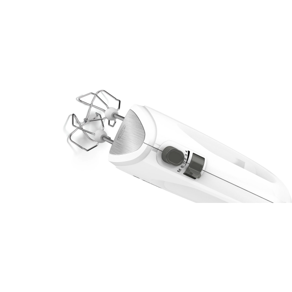 Vermogen 400 watt | Snelheidsstanden 4 + turbofunctie | Kleur Wit/Zilver | Materiaal accessoires Roestvrij staal | Meegeleverde accessoires 2 gardes, 2 kneedhaken | Bediening Ergonomisch ontwerp | Geschikt voor Kloppen, mixen, kneden