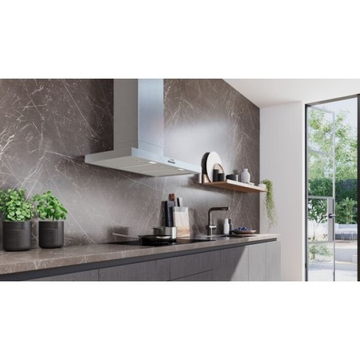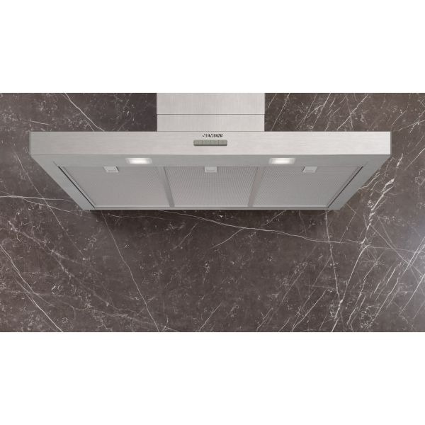 Stijlvolle wandkap van 90 cm met sterke afzuigcapaciteit en zuinige LED-verlichting. Ideaal voor elke moderne keuken, geschikt voor luchtafvoer én recirculatie.