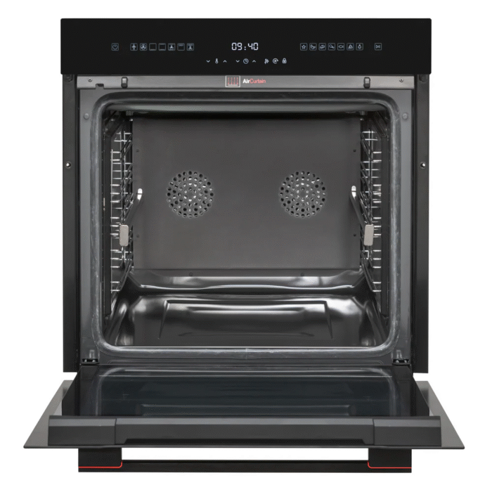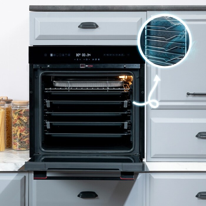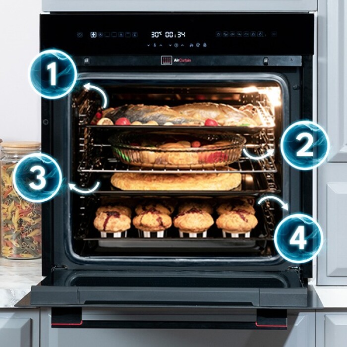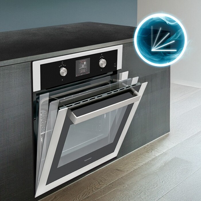 Multifunctionele oven met dubbel ventilatiesysteem voor gelijkmatige warmteverdeling. Dankzij slimme reinigingsfuncties blijft de binnenruimte moeiteloos schoon en kun je meerdere gerechten tegelijk bereiden zonder geurvermenging.
